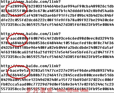 第二点就是百度正对用户体验做出的调整,一直以来,一些无良的站长利用百度漏洞采取黑帽手法做排名,刷排名软件就是其中一个,它就是利用百度在排名结果中引用用户PV的特点,人为制造虚假PV,从而获得好的排名,百度此次更改则影藏了搜索结果的网址,同一时间段搜索的结果网址的代码也是不一样的,如下图:
