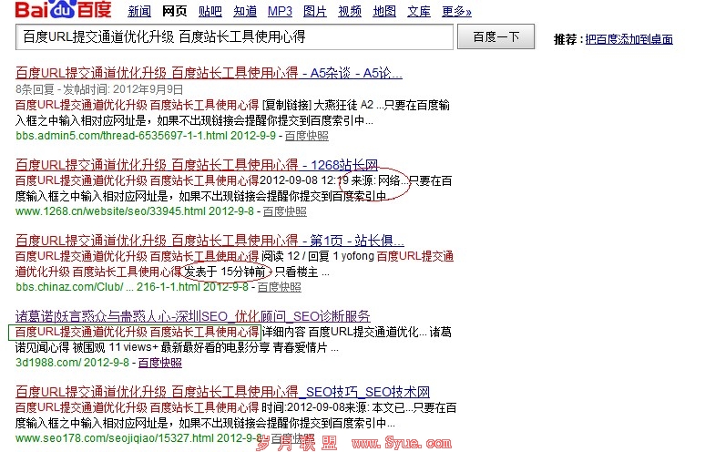 下面诸葛诺就以9.8号那天:百度URL提交通道优化升级 百度站长工具使用心得 这个页面做为例子。虽然是半个小时小时被收录,但是这不影响诸葛诺那天下午发布到站长和a5网站上去。但是更多的没想到那么多网站也同时出现这个内容?如果里面不夹杂着诸葛诺3个词别人又以为本人装13.所以难得介绍。