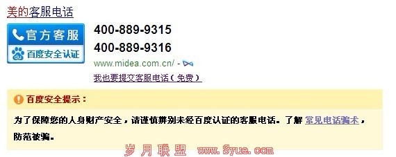 1.为商家提供官方客服电话。百度数据开放平台包括PC端数据提交和移动端数据提交两个入口,站长提交的资源会基于用户需求在PC或移动不同终端的百度搜 索结果页得以展现。但百度官方客服电话的申请具有一定的门槛,要提供相关手续进行审核,主要包括企业营业执照、法人二代身份证或护照、icp备案及注册商 标证,说白了就是要比较正规的企业或者公司才能申请。我们只需要在百度搜索某个公司的品牌关键词,百度就会自动展现一个官方客服电话,如百度搜索“美 的”,就会出现以下结果: