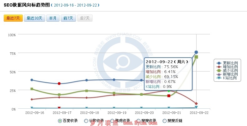 9.22日,百度在收录及K站方面均有较大调整,由站长工具提供的SEO数据风向标趋势 图即可看出,百度此次更新的范围极大,且更新的主要动作是在减少收录页及K除垃圾站点上,数据显示为,总更新比例为75.56%,减少的比例为 69.1%。而K站比例从之前的0.4%上升到0.9%。