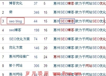 从图上的排名,我们可以发现,seo blog这个关键词排名15,而很奇怪的是,惠州SEO博客对于“seo blog”这个次的密度为零,blog这词更是没有出现在博客的任一博文之中,可是为什么居然有排名呢?而细心发现之下,站长工具这关键词排名中“seo博客”字样居然飘红了?那么,是不是说,我们在做“SEO博客”这关键词排名优化之时,“seo blog”这次也被优化上去了呢?
