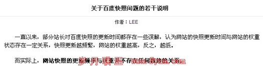 经常在论坛里看到关于百度快照的帖子,内容无非就是说快照更新慢、快照不更新、快照倒退、快照打不开怎么办,网站是不是降权了,怎么恢复等等。这些站长对百度快照的更新时间都存在一些误解,认为网站的快照更新时间与网站的权重状态存在一定关系,快照更新越频繁,网站的权重越高,排名就越好,反之,越低。其实并不是这样,快照跟权重、排名并没有什么关联。我经常这样跟其他站长说,但是大家都不相信。对此,百度官方还做出了专门的解释。下图是在百度站长社区,lee专门做出的澄清,一些主要内容,具体的大家可以去自己看一下。
