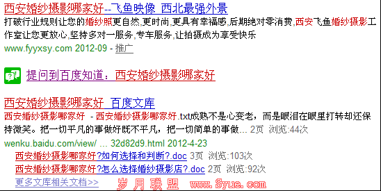 搜索“西安婚纱摄影哪家好”百度排名第一的是百度文库,里面都是一些经验分享如何选择婚纱摄影店和如何判断。这样用户就有了一定的参考标准从而去与你们的服务、环境、客服等等进行对比,那么我们只要做的比百度文库中的好就可以满足用户需求了。