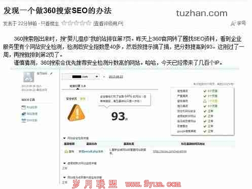 日前,在论坛上有人爆料称发现一个做360搜索SEO的方法:通过360网站安全检测平台,提高网站安全指数,大约一周时间可提高网站在360搜索中的排名。该站长猜测,360搜索会优先推荐安全性更高的网站,这也是对360搜索SEO最快速有效的办法。