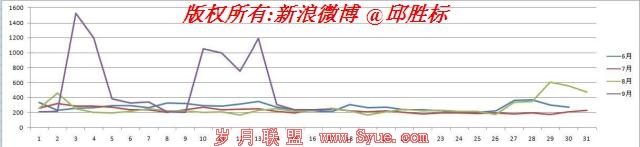 根据这个统计图可以看出,在6月抓取量还是正常的波动,同时七月底抓取上有明显的上升,但是8月10号开始往下波动后就再也没有回到原来的至高点。同时9月8号左右开始呈直线下降趋势,从这个图就可以初步的看出,网站在7月26号开始做过对抓取方面的优化,同时10如果属正常波动的话那么11号12号左右网站应该做过调整,而这个调整是影响蜘蛛对网站的抓取的。网站从9月4号开始抓取量上升,同时8号开始下降,这两个时间点也是有待去分析的。