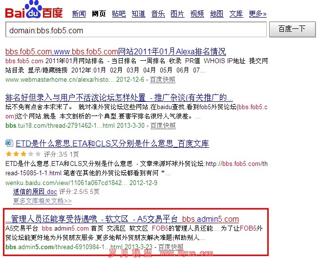对于百度的domain指令,我们可以参考一下 domain:bbs.fob5.com 的结果: