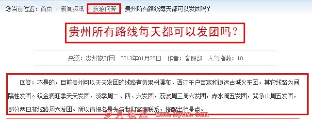 仔细看了一下贵州旅游网上的问答,大部分都对标题、内容、发布时间最了一些规划,从这点可以看出旅游网站还是很重视这一块的,所以笔者认为在自己网站做问答模式的时候要将这三个小部分都规划好,让用户看到内容后不认为是自问自答,而是认为成访客问我们来回答,笔者将自己所看到的与大家分享一下。