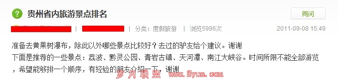 用户体验?一个网站的用户体验是非常重要的,特别是在2013年里的用户体验,已经被SEOer所看重,同时这也是优化网站的重中之重。最近笔者在贵州的各大旅游网站浏览旅游景点的时候发现这样一个问题,绝大部分的旅游网站都在采用通过问答模式来做站,普遍来看这是一个对长尾词有很好的优化方法,也是一个可以提高用户体验的方法。