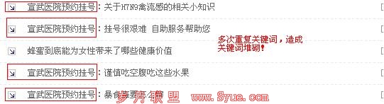 堆砌关键词在以往是一个非常有效的优化手段,但是现在的百度越来越聪明了,只要识别到网站刻意堆砌关键词,都会给予一定的惩罚,网站停止收录也可能由此而引起。堆砌关键词最常见的就是在标题上刻意加上要优化的关键词,如下图: