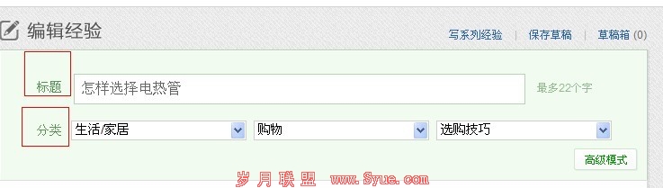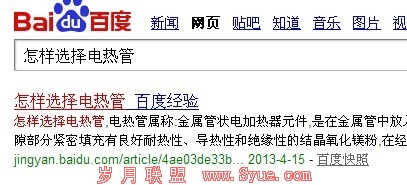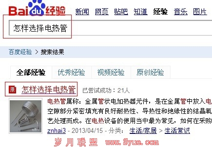 百 度经验的主要目的是:让用户能通过你的经验教程学会某件事物的做法,或是你的经验叙述的能让某件事物由理论化变成实际操作的步骤,所以百度经验的标题是很 有讲究的,所以我们要选择好自己的长尾关键词,如:“怎样选择电热管”“电热管坏了怎么办”“分享电热管的使用心得”等等。标题不需要像软文那样很华丽, 普通的标题,考虑到用户的体验就行。只要是被收录的经验,用户能搜索到相关的标题,百度经验肯定会排在首位的。