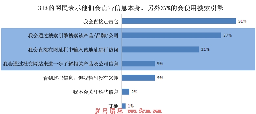 2009年美国搜索引擎市场营销公司iProspect发布的最新调查报告显示,52%网民会对各类网站上出现的在线品牌信息作出积极反应,反应方式包括点击在线品牌信息、进行相关搜索、通过链接访问该信息的品牌企业网站等。对在线品牌信息做出反应的网民数量几乎同直接点击该信息的网民数量一样多。