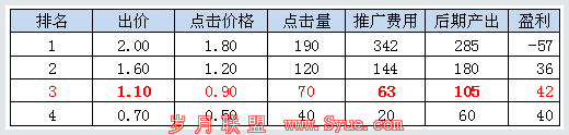尽管第一名能获得最高的点击量,但如果激烈的竞争致使点击价格过高,预算会在这种出价的血拼中迅速消耗光,这很有可能背离了营销的初衷而变成了一场逞强好胜。也许,用较低价格选择第二名是更明智的选择。合理的出价是基于投入产出的综合统筹,对一个关键词进行下表所示的排名与盈利的分析后,出价再也不会是一项困难的工作了。