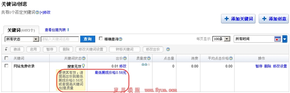 在管理关键词/创意的界面里,如果关键词低于起价,系统就会有如下图红圈标注的搜索无效的提示。