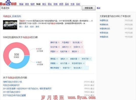 以口碑搜索为例,搜索今年上海车展的热门车型“马自达6”可以发现,基于该车型的相关信息均呈现在结果页面里,包括网友对于该车的优缺点评。同时,百度知道还会智能推荐出相类车型的对比检索,为用户直观地提供两款车型的口碑对比。目前口碑搜索已涵盖汽车类、手机类、笔记本电脑和相机类的关键词,后续还将提供更多的类别。
