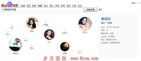 而数据图谱功能目前主要满足用户对人物类信息的检索需求,比如用户问“天蝎座的明星”时,百度知道能够对用户的提问内容进行精准识别与理解,并依托知道的实体信息库,对用户的提问进行查询和推理计算,并最终将用户需要的答案通过直观的可视化技术方案进行呈现。