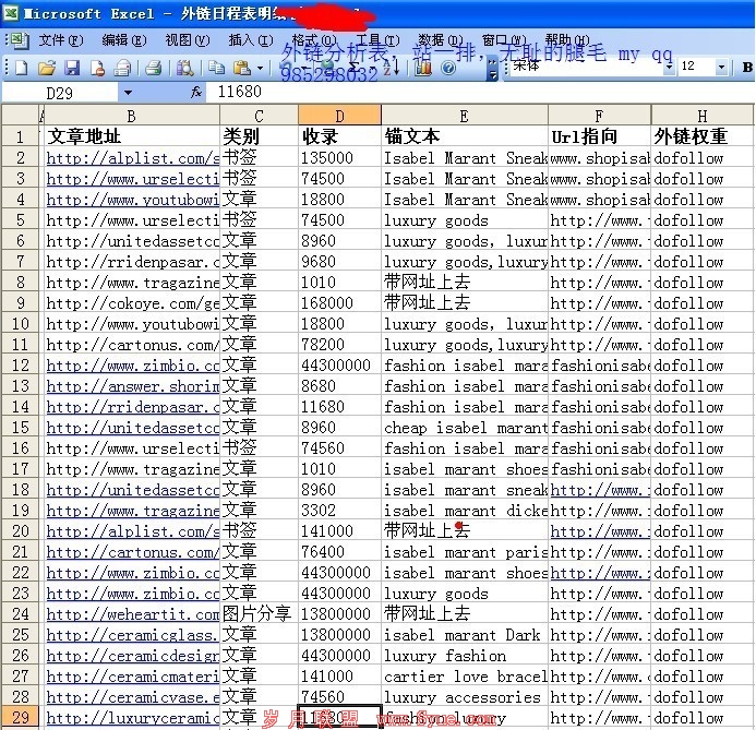 其实说到外链很多做SEO的认为,只要外链数量多就行了,这是中文搜索引擎SEO的一个误区,其实搜索引擎在于的是外链的质量和外链的广泛度,如何去寻找外链资源和发布外链呢,在我SEO生涯当中做的更多的而是寻找外链资源,而不是去发布外链,一个发布外链的人,他不是在做SEO,真正的SEO在于数据分析,外链资源寻找,竞争对手的数据分析,其实说到发外链每个人有每个月不同的方法,最主要的是还在于资源的寻找,如果你是做正品,那些有带nofollow标签的链接可以发点,如果你是做仿牌的话带nofollow标签尽量不要去发,更多的需要自己去慢慢体会,不是我说出来怎么做,你们就知道的,操作教一下就会,但是SEO的思维和思考方式需要自己去摸索,这才是最重要的。你发布100条垃圾外链,不如你发一条高质量的外链,所以说,外链在于质量而不是数量(发布的外链最好用Excel表格记录下来,方便日后重复利用,分析这些外链给你带来的权重,这是对于关键词排名最重要的一项数据分析),但是外链发布的类型也不能太单一了,比如你发论坛,也要去发一点书签,新闻类型的网站,这样更好的利于你排名,在是一个域名的广泛度,不能只光发.com就忽略了.net .cn这些,以每天10-20条外链的速度增加,而不是一下突然猛增,搜索引擎会认为你在作弊,最后结果你懂的,做SEO重要的一点在于循序渐进。外链基本上也讲的差不多了,下面我们来讲讲第四步,具体如何发外链,怎么寻找资源的方法实在是太多了,我也不做多的介绍了,自己从经验当中积累吧。