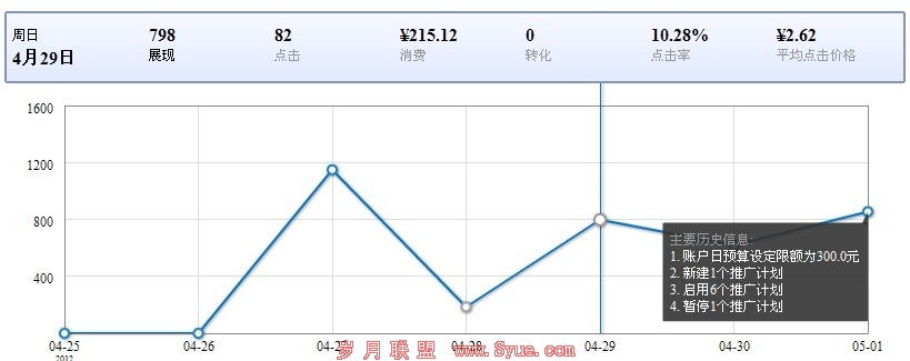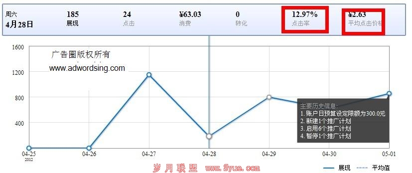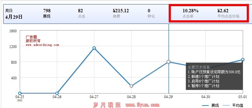 该账户在广告刚刚上线的时候,只建了一个广告系列。通过账户修改历史记录,我们可以看出实际情况。在4月28日,账户操作最多的是新增广告计划和单元。我们来看看4月28号对账户结构进行调整之后的数据。