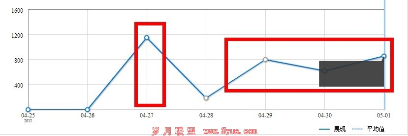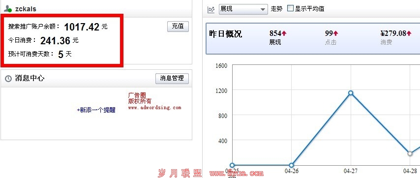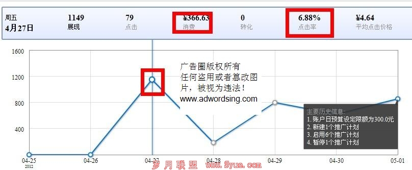 我们的实验开始了,大家可以清楚的看到51啦统计开始的时间是2012年4月27号14点,广告审核通过并且上线的时间是14点30分左右。