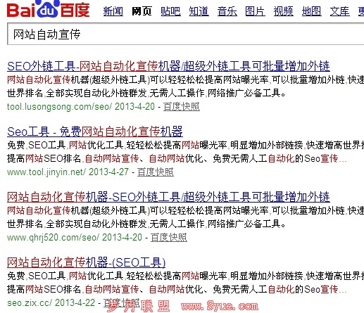 记得几年前,我们还在用查询类外链提高自己的百度domain数量,那个时候在网页上直接运行一台电脑然后开始不断的刷,更有甚者,机器开一天,然后等待百度下一次更新的时候,就让很多的查询类外链踊跃而出,提高了不止一倍,这何尝不是一种很好的方式呢?就比如说下图就为查询的一个例子,“网站自动宣传”