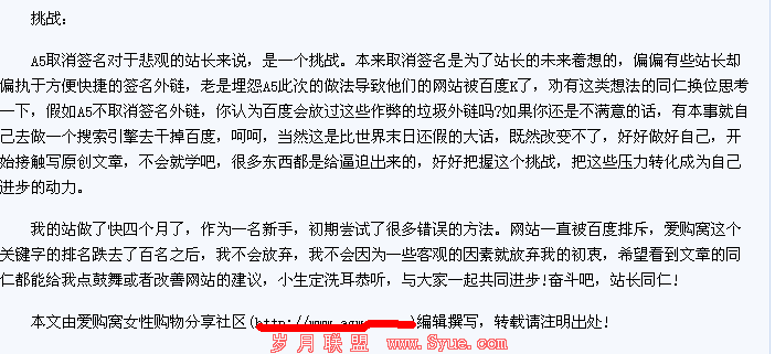 其次,对于重要的网站,我们就可以不用发软文外链,因为软文是需要付费的,我们尽量去寻找付费少,或是不需要付费的高质量平台去发外链,上述提到的百度文库、豆丁文库、论坛签名,可以到a5这样的网站上去投稿,投稿不收费,但是对文章的要求相对较高,需要原创,而且是技术操作层面的,一般广告太明显的文章直接被删,多是在文章末尾提一下自己的公司名字,网址就可以了,网址也是纯文本的链接地址。