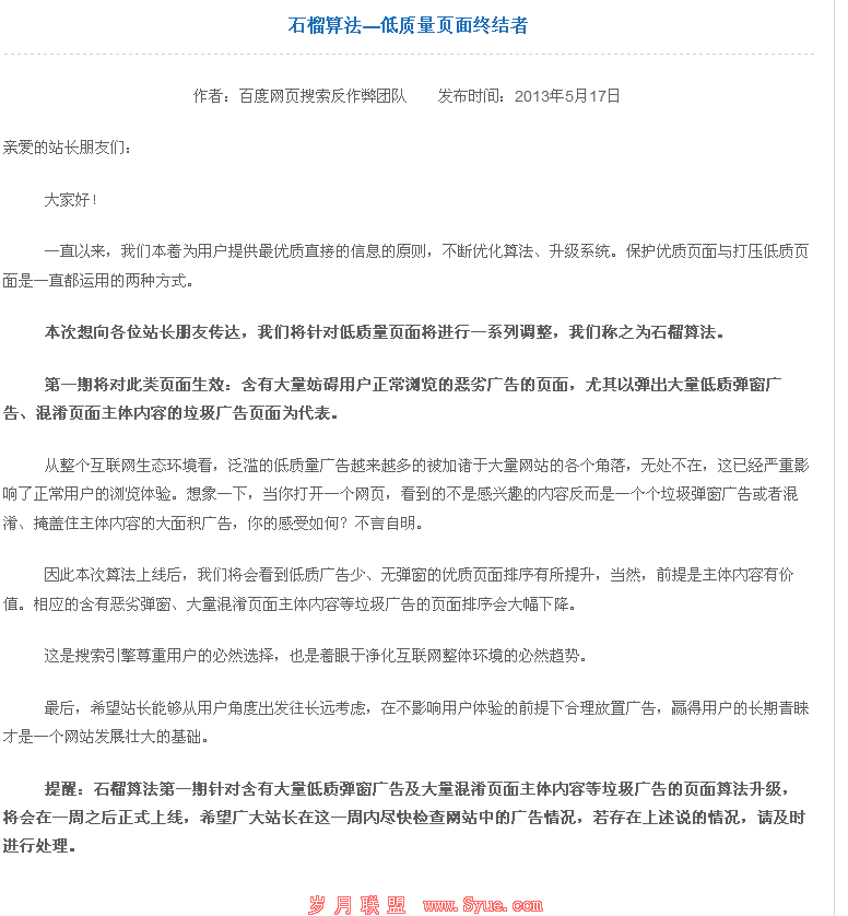 有资深的站长已经在各大论坛里面探讨过这次算法的具体内容。石榴算法主要是针对这个方面,前期将重点整顿含有大量妨碍用户浏览的恶劣广告的页面,这方面站长要注意,网站千万不能被黑。每天及时抽空查看网站数据,查看是否出现问题,如果有问题的话,需要站长及时处理好。尤其是那些弹出大量低质弹窗广告、混淆页面主体内容的垃圾广告页面,百度此举意味着那些垃圾网站将受到打击。