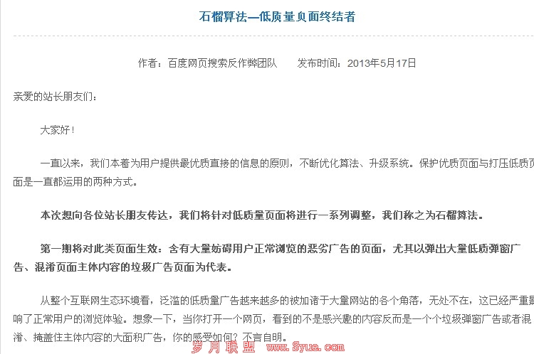 作为一名站长来说,无时无刻都会关注搜索引擎的一举一动。就在昨天的百度站长平台中,让笔者看到一篇名为《石榴算法-低质量页面终结者》的文章,文中着重说明了这次更新的算法主要是针对那些含有大量妨碍用户正常浏览的恶劣广告的页面,尤其是针对一些弹出广告和主题内容无关的垃圾广告代表的网站。对于含有文中所提到的这些广告网站,将会受到一定的惩罚。这是百度又一次针对性的大调整。目的不用说也知道了,一切只是为了提升用户的体验效果。