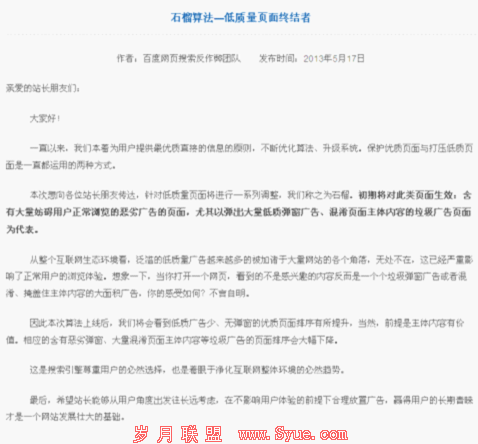在百度推出绿萝算法之后,在2013年5月17日,百度再次升级算法推出了石榴算法,当然在石榴算法上线,让很多的站长产生了议论,究竟石榴算法的寓意是什么?从百度公告不能看出,百度的石榴算法最终目的是终结低质量页面,让垃圾广告页面靠边站。公告如下: