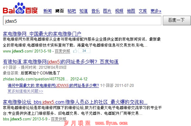 那么我说的方法就是:直接搜索网站域名中部的英文字母,一定不能加www也不加com。比如查看家电维修网,可以直接在百度上搜索:jdwx5 。