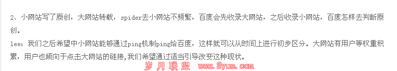 这种问题,我想小网站的站长们都遇到过,除了无奈我们还能做些什么呢,只有加紧时间提升网站的权重,也在扬眉吐气一把,虽然这种情况时有发生,但是,只要是好的文章百度也不会坐视不理,收录还是会收录的,只是对于排名帮助不是很大,但是,这条路线我们不能放弃,虽然条条大路通百度,原创却是一条捷径。