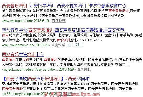 标题的撰写就不在多说了以网站的核心项目为准不要超过35个字否则就属于长标题,我将其改为“现代音乐学校-西安音乐培训_西安架子鼓培训_西安声乐培训”至于关键词的选择就要根据竞争程度和搜索量来筛选,不要看被人选什么词自己也选什么词。描述的撰写要简明扼要足够吸引人“西安现代音乐艺术学校全国拥有多家连锁分校,总部位于西安市南郊文化区,拥有排练厅、练功房、录音室及各类专业教室,采用Roland、Yamaha、Meinl、Pearl等国际一流教学实训设备。”而搜索“西安音乐培训”其他网站都讲自家有什么课并没有突出自身的优势,这样撰写会让用户眼前一亮果断点击你的网站。