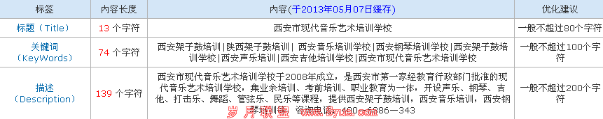 优化的重点当然以首页为核心,那么我们先来看看网站首页的标题和描述,标题只有一个“西安现代音乐艺术培训学校”描述属于典型的长描述而且没有什么吸引人的亮点!