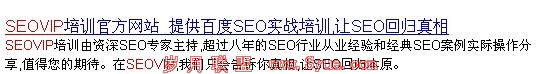 以往的优化技巧也提及到,要求我们注重网站title、keyword、description这三大标签的填写和优化。尽管现在的三大标签在优化权重中起到作用已经越来越少了,但是却仍然是优化人员必须注意的细节,特别是description---网站的描述。很多站长对网站描述不予重视,只是随便把网站上的一段文章填上去就完事了,他们认为这些描述对网站排名起不了什么作用。但是事实告诉我们并非如此,就像我们的seovip一样: