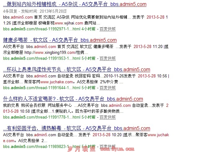 从上面的外链数据我们可以看出数据相差太大,那是不是有好多外链不是被百度工具认可的外链呢?下面在看A5论坛的外链数据,A5论坛是每个站长每天都逛的论坛,做外链的首选,笔者也不例外,每天做的数据都有十几条,均被收录,看截图。