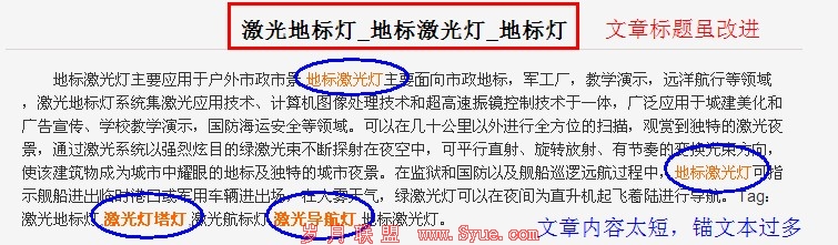 该网站的文章质量低下,表现在标题全是关键词堆砌,而且与搜索引擎中的收录页面相似度过高;文章内容较短,且没层次分明;文章锚文本过多。