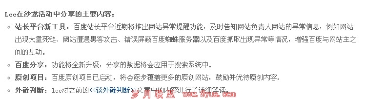 这次活动邀请了知名的多家知名网站、资深SEOR及多站长参与,其目的就是看看对于出台的这些政策,围绕百度这块的项目该怎么展开,对于站长们是否有什么苦衷,这也是一个互动的过程,在这个过程中,用户——百度——站长,就是围绕这三个点展开。