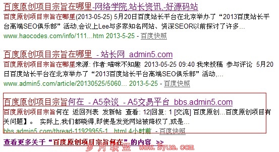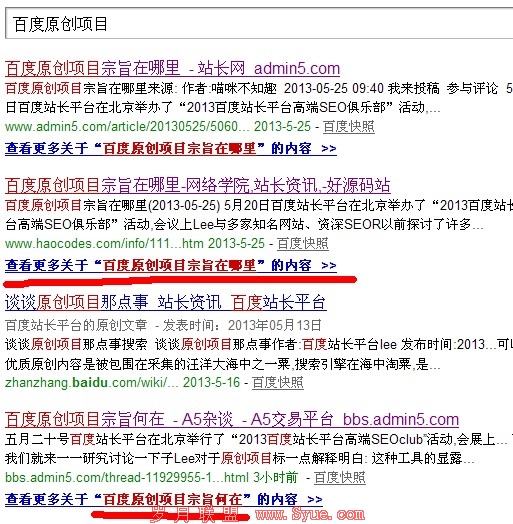 我在百度上搜索“百度原创项目”,我在返回搜索结果页面随意点击一个标题,在URL下面弹出“查看更多关于“关键词”的内容>>”,并且字体加粗显示,如图所示: