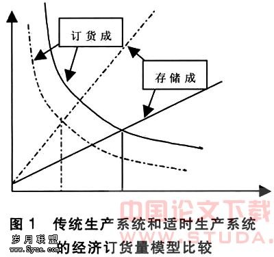 图1中订货成本线和存储成本线的交点向坐标轴左边移动,意味着经济订货量下降,说明电子商务环境下的存货控制。由于采用了适时采购,减少了供应商的数量,与供应商签订长期供货协议,减少了付款次数和材料检验次数,使存货的订货成本大大减少。同时,适时生产系统将存货的存储视为无效和浪费的行为,考虑到其机会成本及经济订货量下降等因素,存货的单位存储成本将会增加。