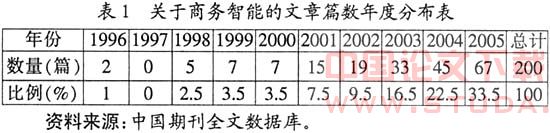 (1)数量分布统计分析。笔者利用清华同方期刊全文数据库检索系统(Web),分别以“商业智能”、“商务智能”为检索题进行篇名检索,得到221篇文章(论文、简讯等),通过内容分析,除去内容重复的和明显不符合我们主题的文章,得到以下统计结果(见表1)。