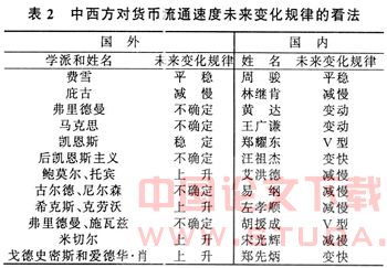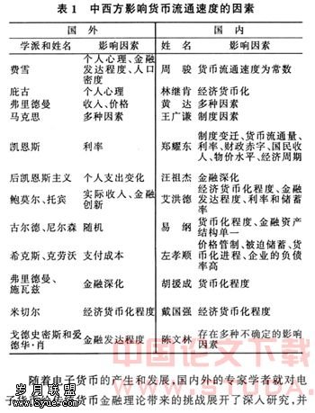 根据巴塞尔委员会的定义:电子货币是指在零售支付机制中通过销售终端、不同的电子设备之间以及在公开(如Internet)上执行支付的“储值”和预付支付机制。货币流通速度则是指一定时期内(通常为一年)货币流通的次数。国外许多学者对影响货币流通速度变化的因素进行了研究,虽然取得了一些有价值的研究成果,但对货币流通速度的稳定性没有达成一致性的结论。随着西方经济货币理论的引入,我国的经济学界许多学者也对的货币流通速度做了大量理论和实证的研究工作,并提出各自的观点和假说解释我国改革以来货币流通速度长期持续下降的原因。由于篇幅所限,本文不对各种观点进行一一述评,只将中西方对影响货币流通速度的因素及其变化趋势中具有代表性的观点如下:(见表1、表2)