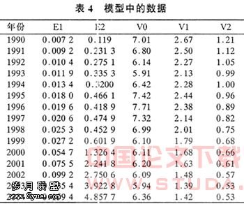 将不同层次的货币流通速度作为被解释变量,以电子货币年末存款余额占狭义货币量M1的比重(E1)和电子货币年交易量占年末社会商品零售总额的比重(E2)作为解释变量建立线性回归模型。选择电子货币年末存款余额占狭义货币量M1的比重(E1)的理由在于:就当前我国电子货币发展的情况看,电子货币还处于发展的初期阶段,它主要取代的是流通中的现金和活期存款(M1),并通过这种替代作用来改变货币结构,进而影响货币流通速度。选择电子货币年交易量占年末社会商品零售总额的比重(E2)的原因是:在电子货币发展的初期阶段,电子货币主要用于小额支付,它的作用也主要是取代传统的现金支付和部分小额的转账支付,它对货币流通速度的影响可通过电子货币的交易量在社会商品零售总额中的比重表现出来。模型中的数据如表4。