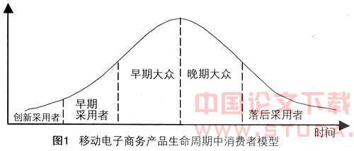 我国移动B2C前景广阔,但目前处于快速发展的门前。怎样迈过这一门槛,开拓这个丰饶的市场呢?根据对新产品接受态度的差异,美国学家罗杰斯(E.M.Rogers)把消费者划分为5种类型:创新采用者、早期采用者、早期大众、晚期大众和落后采用者。不同类型的采用者各自所占比例不同,采用时间大体服从统计学中的正态分布,参见图1。该图大体体现了当今消费者的类型。这五类消费者构成了高科技产品的两大类重要市场:早期市场和大众市场。尽管这种划分并非精确,但对于探讨移动电子商务市场开拓提供了一种全新的思维方式。