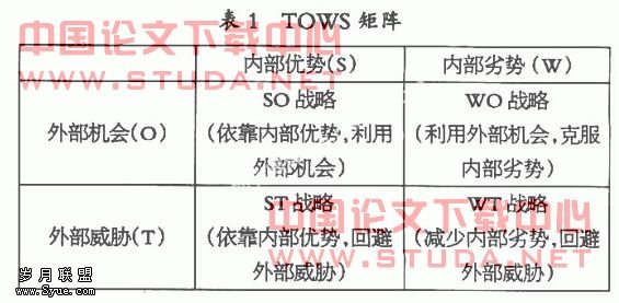 SWOT分析框架通过建立TOWS矩阵,提供4种战略,即SO战略、WO战略、ST战略和WT战略,如表l所示。