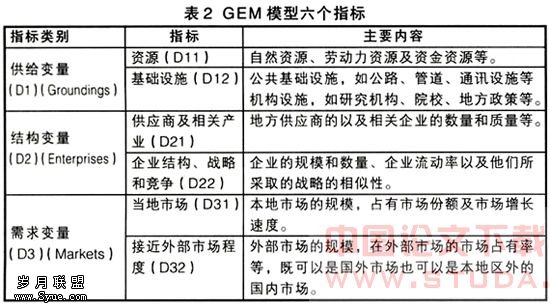 Padmore和Gibson(1998)在波特的钻石模型基础上,选取三组变量作为评价指标,建立了GEM 模型来评价产业集群竞争力的高低(见表2)。