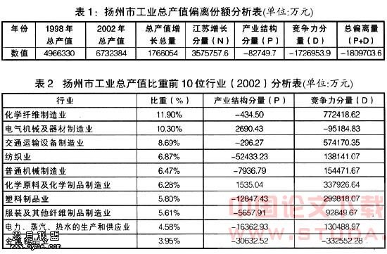 为揭示扬州市工业发展中的产业结构问题,我们列出了扬州市工业总产值比重前10位的行业的偏离份额分析表,见表2。