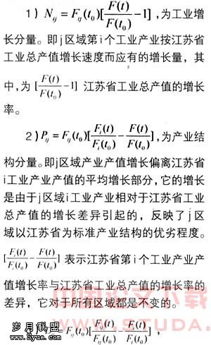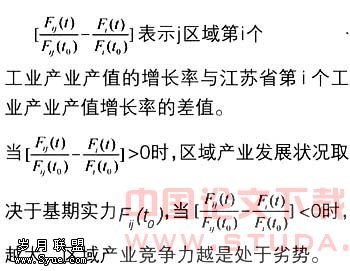 为竞争力分量。它是j区域第i个工业产业产值增长额分解的剩余部分,即扣除工业经济增长分量和产业结构分量之后的增长额。由于剩余部分的正负大小体现了该产业在江苏省同行业中的相对增长水平,反映区位优势或地区竞争力对区域经济增长的作用,故称为竞争力分量。利用竞争力分量既可以判断某区域工业产业在江苏省同行业中所占有的竞争地位,又可以分析江苏工业经济增长中各产业部门相对发展和收缩的区域。