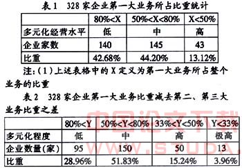 文章的研究样本来自截至2004年12月31日,依然在深圳证券交易所上市交易的全体上市公司,根据统计共有530家企业,按照证监会以及中国工商管理总局颁发的企业经营范围明确规定的标准作为分类标准,把企业分为是否从事多元化经营。具体的分类办法如下:企业的主营业务收入中至少有三类不同的业务,按照这个标准,共挑选出328家公司,因此可以简单地说明,在深交所上市的国内企业中至少有61.88%的企业都在不同程度的从事多元化经营,反映了市场经济条件下企业多元化经营的普遍性,表明企业已经不再仅仅局限于规模经济,也在不断地追逐范围经济,至少是追求范围经济和规模经济的结合。