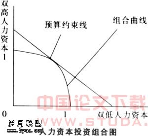 基于以上分析,企业的人力资本组合投资模型如图所示,横轴表示双低人力资本,1表示完全的“双低”的人力资本投资;纵轴表示“双高”人力资本,1表示完全的“双高”人力资本投资。某一投资组合可能是图中的组合曲线上的一点,即有一定比例的“双高”人力资本和一定比例的“双低”人力资本所组成。这意味着,一项组合投资可能是“双高”人力资本多于“双低”人力资本,也可能后者多于前者,要视具体情况而定。预算约束要求企业在决定人力资本投资时,必须对本企业的实际情况了解,因为一定的效用总是要有相应的投资水平作保证。