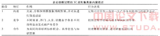 在3C创新过程的每一阶段,各创新要素有着不同的行为与作用。事实上,企业实践过程中沟通、竞争、合作三个阶段不是截然分开、泾渭分明的,而是有机的整体,尽管有先后次序的不同,但各阶段之间是有机联系的,并且不同的企业由于其基础条件、发展阶段的不同,各个阶段的作用大小、所需时间长短等也是不同的。本研究从学术研究的角度将这一过程分为三个阶段,无论是从理论还是企业实践的角度都是很有意义的,一方面,为了使得对协同的研究更加深入细化,丰富和发展创新管理理论,另一方面,从实践的角度为企业有针对性地根据各阶段的作用、特征和自身存在的问题寻找提高途径提供具有实际意义的指导,从而可以提高创新管理水平和创新绩效。