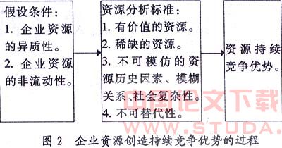随着企业资源基础理论的出现和发展,战略管理领域的研究相对于外部机会和威胁,更加注重企业内部的优势和劣势。核心能力理论在资源异质性和非完全流动性的基础上,提出了分析企业持续竞争优势的理论模型(如图2示),概括了资源异质性和粘性、企业资源、持续竞争之间的关系。这一框架可以用来分析各种资源的潜力,从而为企业培育和创造持续竞争优势提供依据。
