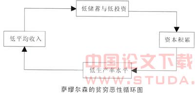 从上图中,可以看到一个恶性经济循环的过程,其中的低收入因素导致整体经济陷入一个怪圈。这就是典型的恶性经济制度安排的结果。低收入导致了低储蓄与低投资,从而妨碍了资本积累。资本不足妨碍了在生产中使用机械,阻止了生产力的迅速发展。而生产力水平低下又造成收入水平低下,另外一些与贫穷有关的因素也在这个过程中得到自我加强。财富再生机制则是通过合理收入分配,提高真实的人均收入,促进经济的良性循环。